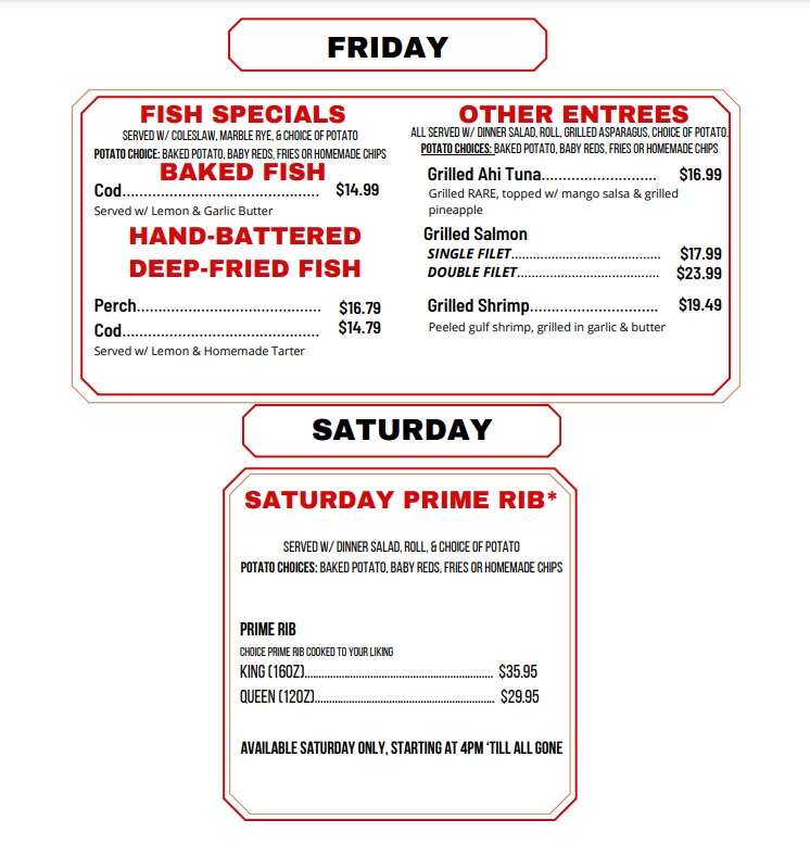 Everything from Appetizers, Garden Fresh Salads, Signature Sandwiches, Friday Night Fish Fry, & Saturday Prime Rib!